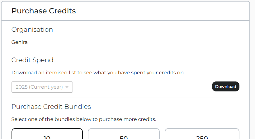 The Credit History Report in Genira provides a detailed, downloadable summary of how your organisation’s credits have been used and ver time.